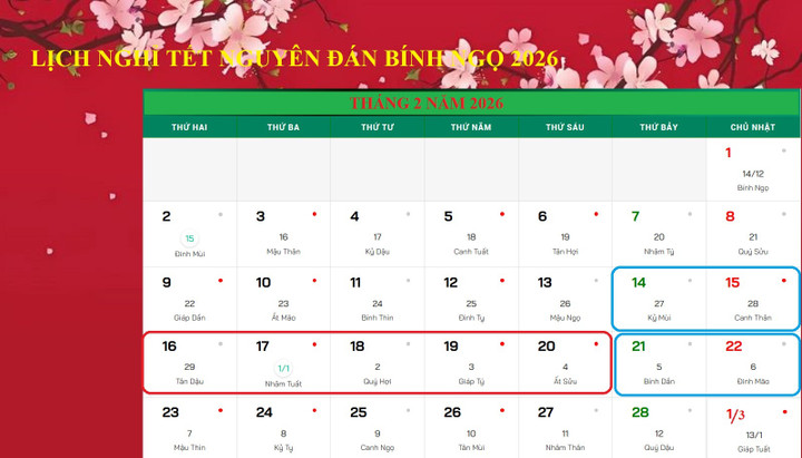 Tuy nhiên, do 5 ngày nghỉ Tết trọn vẹn trong tuần nên đối với người lao động có lịch làm việc mỗi tuần 5 ngày, nghỉ hai ngày thứ Bảy, Chủ nhật, đợt nghỉ Tết Âm lịch 2026 sẽ kéo dài 9 ngày liên tục (có 2 kỳ nghỉ cuối tuần liền).